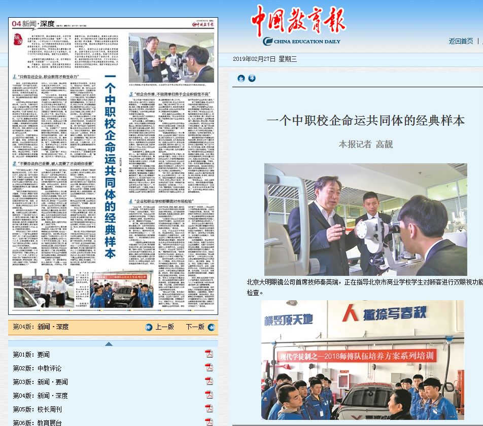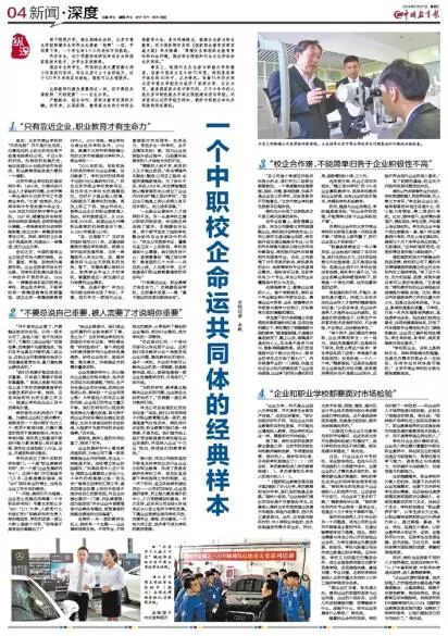 在国务院《国家职业教育改革实施方案》正式印发不久,中国教育报在《新闻》栏目中以“一个中职校企命运共同体的经典样本”为题,用整版篇幅对北京市商业学校“进行了深度专题报道。