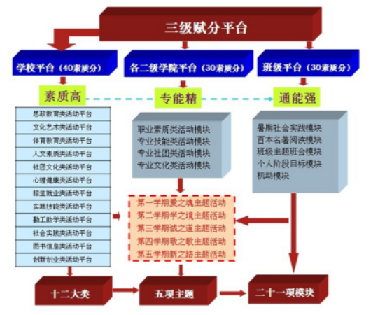 学院制定《学生课余素质教育评价方案》,素质学分进入每一个专业的培养方案,并颁发《大学生素质拓展证书》作为学生素质教育成果的评价载体。公开出版《高等职业院校素质教育课余实践导引》,为众多院校采用。